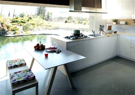 Bij de Orange keuken heeft Snaidero er voor gekozen om het concept uit te breiden met tafels en stoelen.